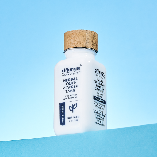Our Herbal Toothpowder Tabs are packaged in infinitely recyclable glass bottles, sealed with a pesticide-free bamboo cap with a recycled aluminum insert. According to the World Health Organization, 6 toothpaste tubes per person are discarded annually. That's billions of tubes per year going into the landfill. Switch to our tabs in glass bottles, for a more convenient oral care experience while not harming the planet.